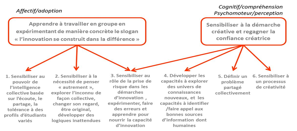 -Comprendre les apports des techniques de créativité -Renforcer l'usage de ses habiletés de pensée afin de développer sa créativité. -Expérimenter un processus de résolution de problème afin d’imaginer et de créer en équipe des solutions innovantes. -Le travail réalisé est orienté non seulement sur le savoir-faire mais également sur le savoir-être qui sont les deux piliers de ce module de formation. |